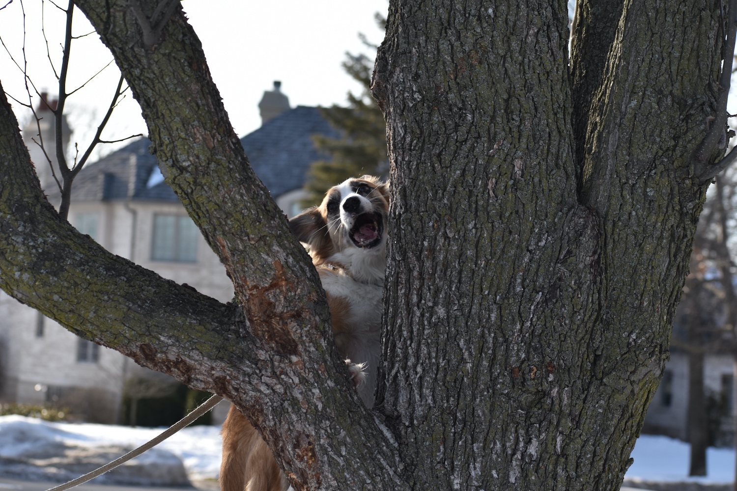 On walks, Moose tenses with excitement at every tree he sees. No squirrel necessary. He then looks to Sally for permission to climb — which is usually granted.