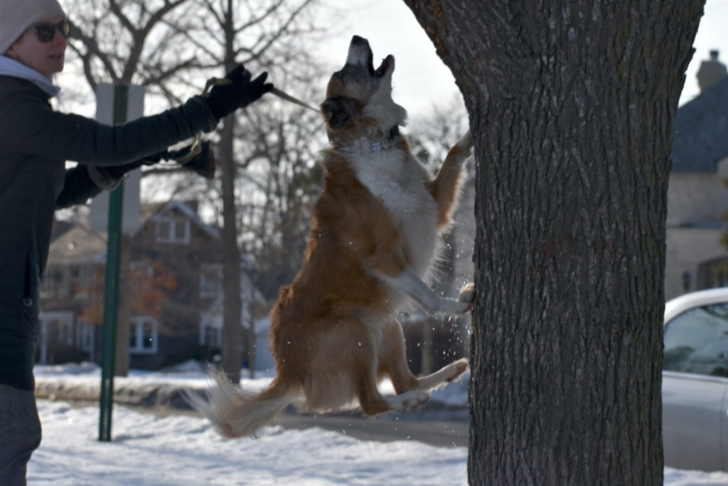 Now 3 years old, Moose doesn’t need squirrel competition anymore. He is known throughout Glencoe as the dog who climbs trees.