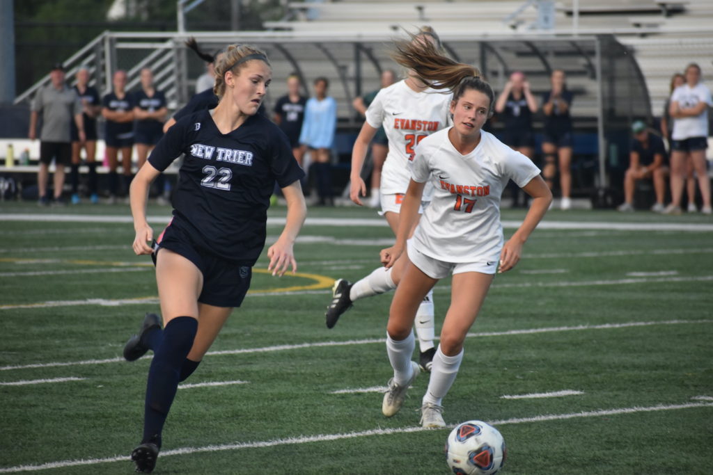 The ‘Kits junior midfielder Adriana Merriam ripped a series of long-distance shots on goal within the half’s first 15 minutes. But New Trier’s goalkeeper Wynne Hague was up to the challenge.