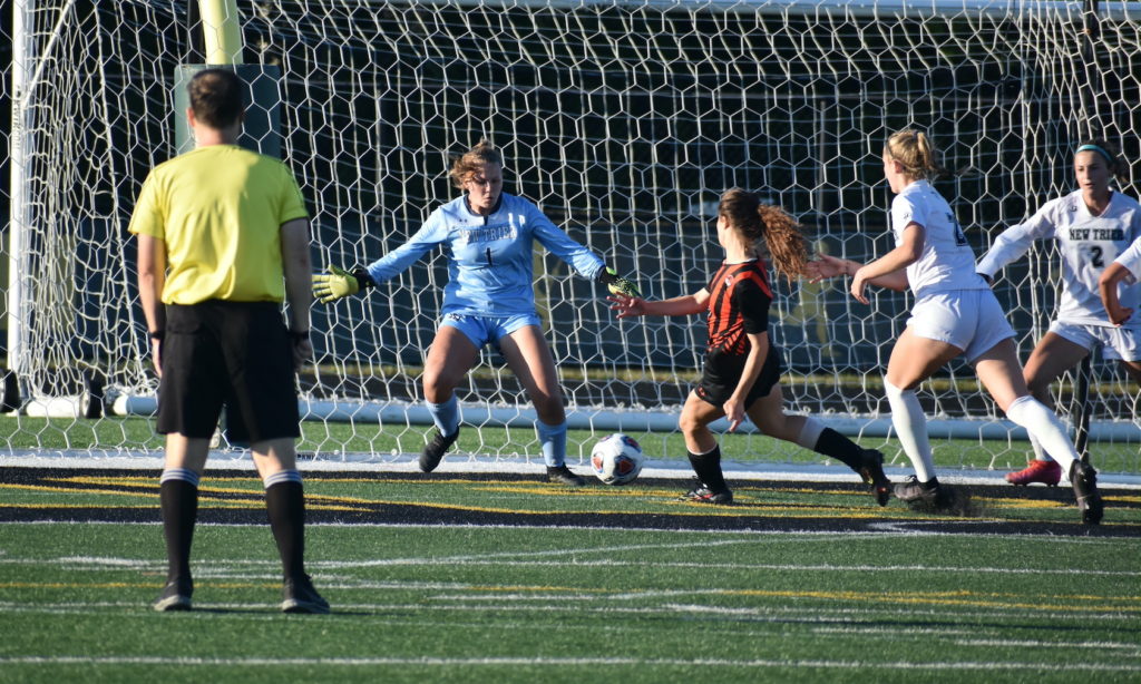 Late in the second half, New Trier’s attack intensified. A goal seemed imminent, but it never came. Kate Dobsch put a trio of shots on goal and was once blocked in front of the net by a lunging Wildcats defender. A shot by Alex Wirth skipped inches wide, and a try by Caroline Finnigan sailed over the crossbar.