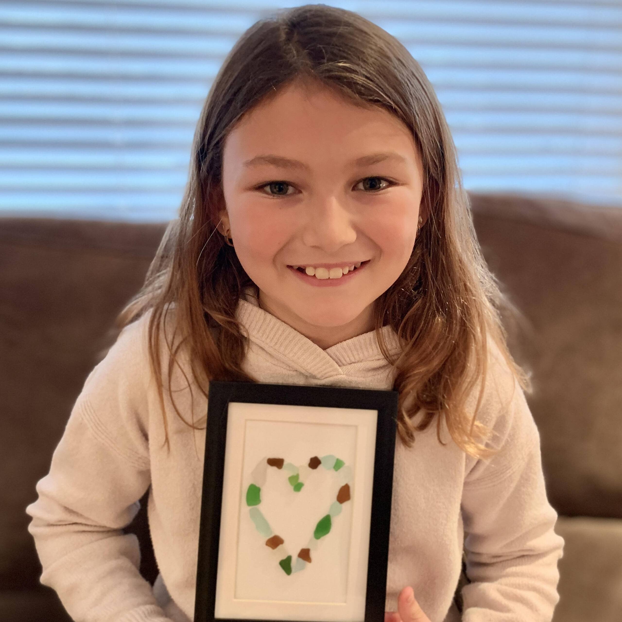 Emmy, a fifth-grader at Highcrest Middle School, created and framed hearts made from sea glass collected on the shores of Lake Michigan and sold them to friends and family, raising close to $1,500 for the victims of the deadly storm system.