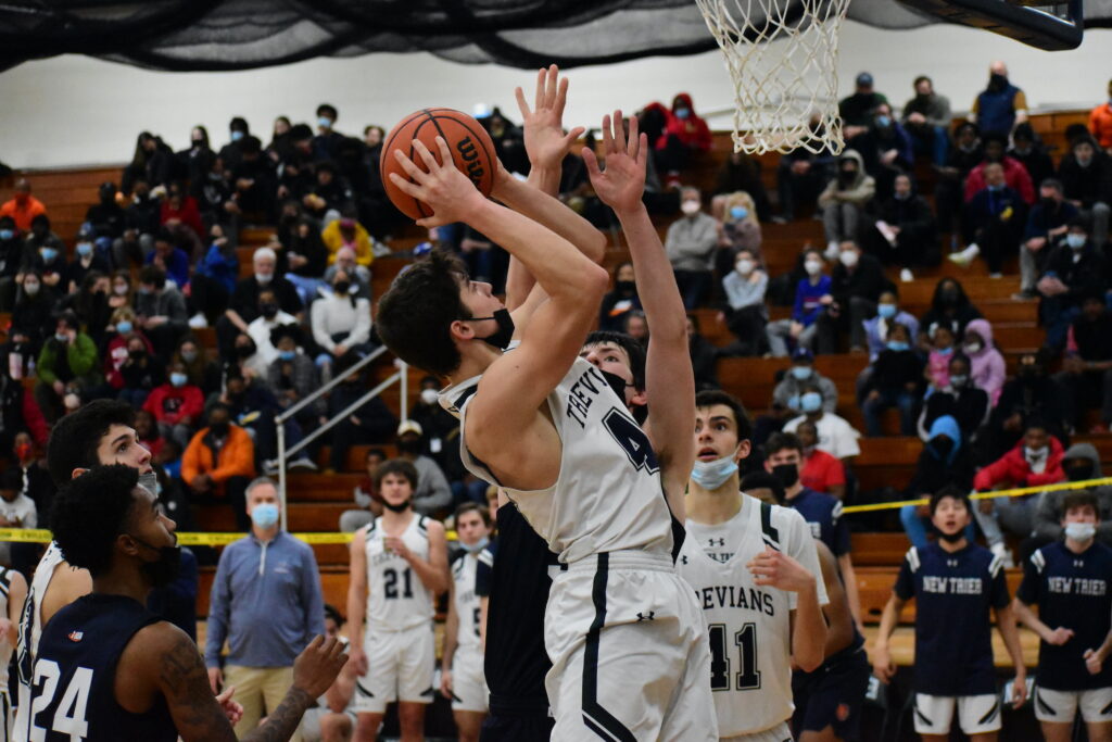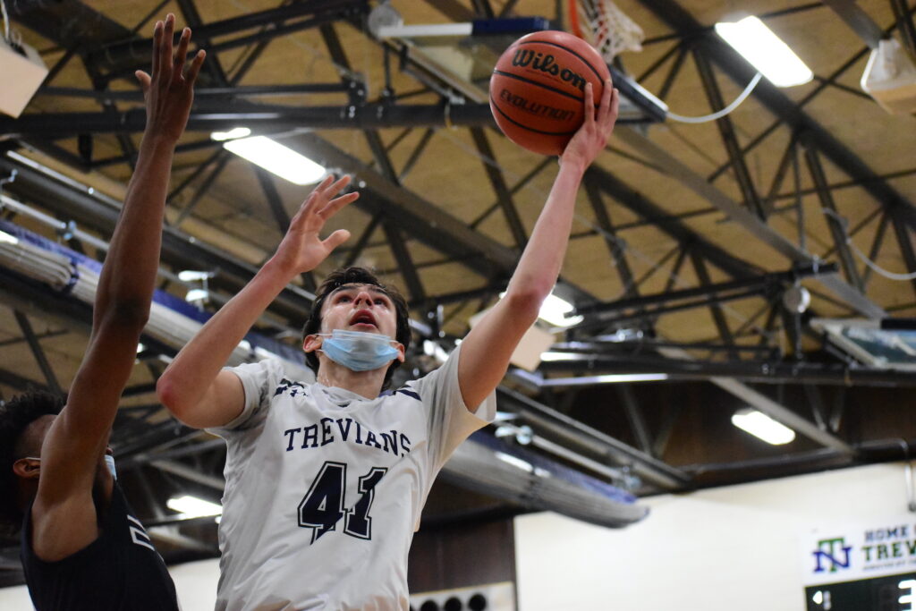 Noah Shannon fights through contact to put up a shot for the Trevians.