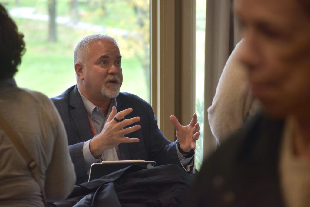 North Shore District 112 Superintendent Michael Lubelfeld talks with a resident following the session.