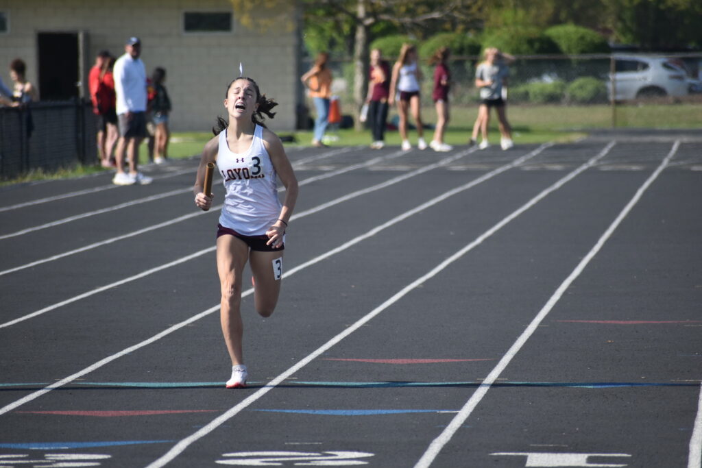Loyola Academy’s Lauren Woodward fights across the finish line to cap the 4-by-800 relay’s state-qualifying time.