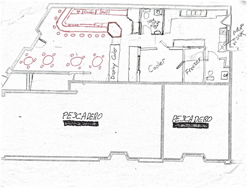 Molly Veneziano said the group plans to revitalize the space by returning it “back to its original glory” with a higher, tin roof, wood flooring and more. According to preliminary plans for the business, a J-shaped bar and a few tables would dominate the front of the house, pushing some of the market’s display cases and shelving to the back room; however, the primary display case would remain on the east wall.