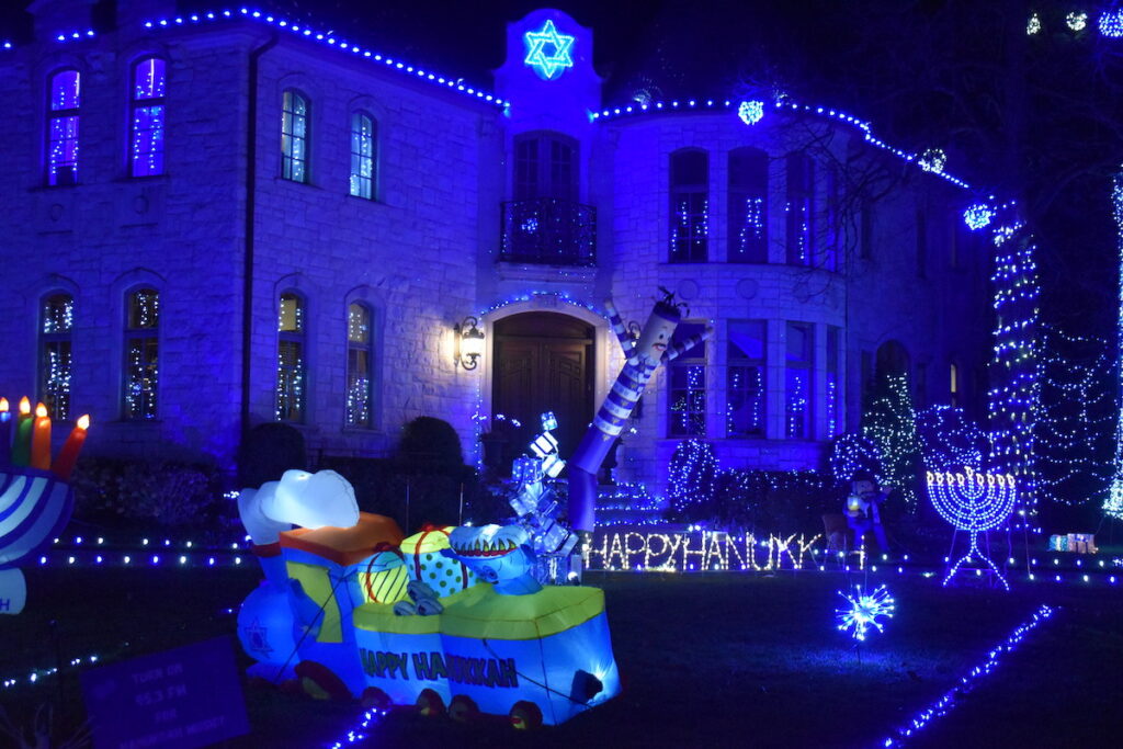 The Hazan family is back at it again with their tribute to Hanukkah in Glencoe. The display is outrageously fun with numerous inflatables (menorah, dreidel, train, more) surrounded by blue lighting. The display stays up through December.