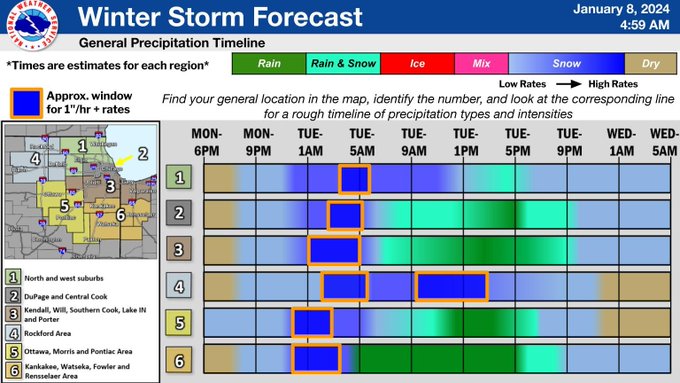 NWS Chicago says Tuesday, Jan. 9’s activity is “the second more robust wave” and is expected to begin mid Tuesday morning with precipitation continuing through the evening hours. The snow is expected to transition to rain in Chicagoland while the snow shifts to northwest Illinois.