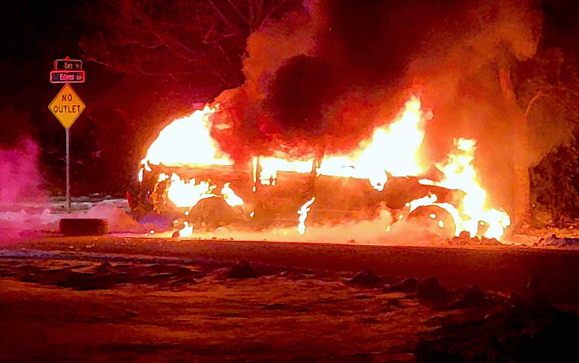The driver exited the vehicle unharmed before the vehicle became engulfed in flames.