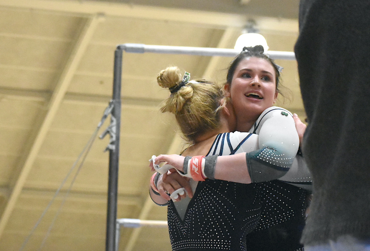 A lot of the time my teammates and I, we will talk to each other about our goals and what we’re going to do. The start of the meet we do a cheer as a team and (one of the captains gives) a speech.