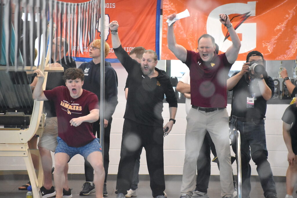 Loyola Academy coach Mike Hengelmann (right) and company cheer on the team’s 400 free relay.