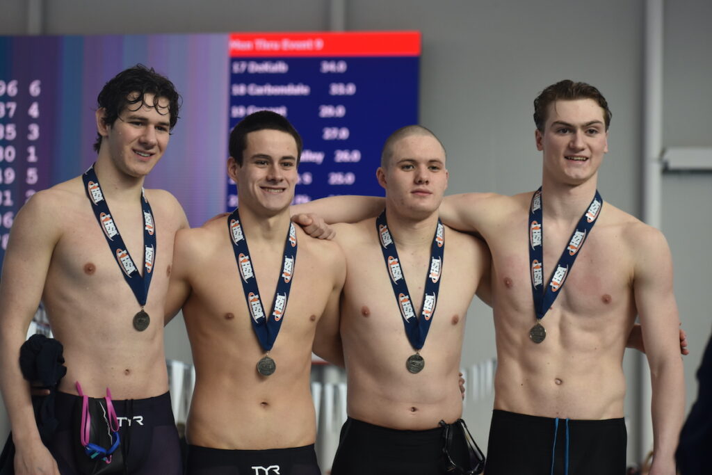 New Trier’s 200 free relay team of (left to right) George Angelov, Clay Perry, Augustus Noreuil and Aiden Musick after a runnerup swim.
