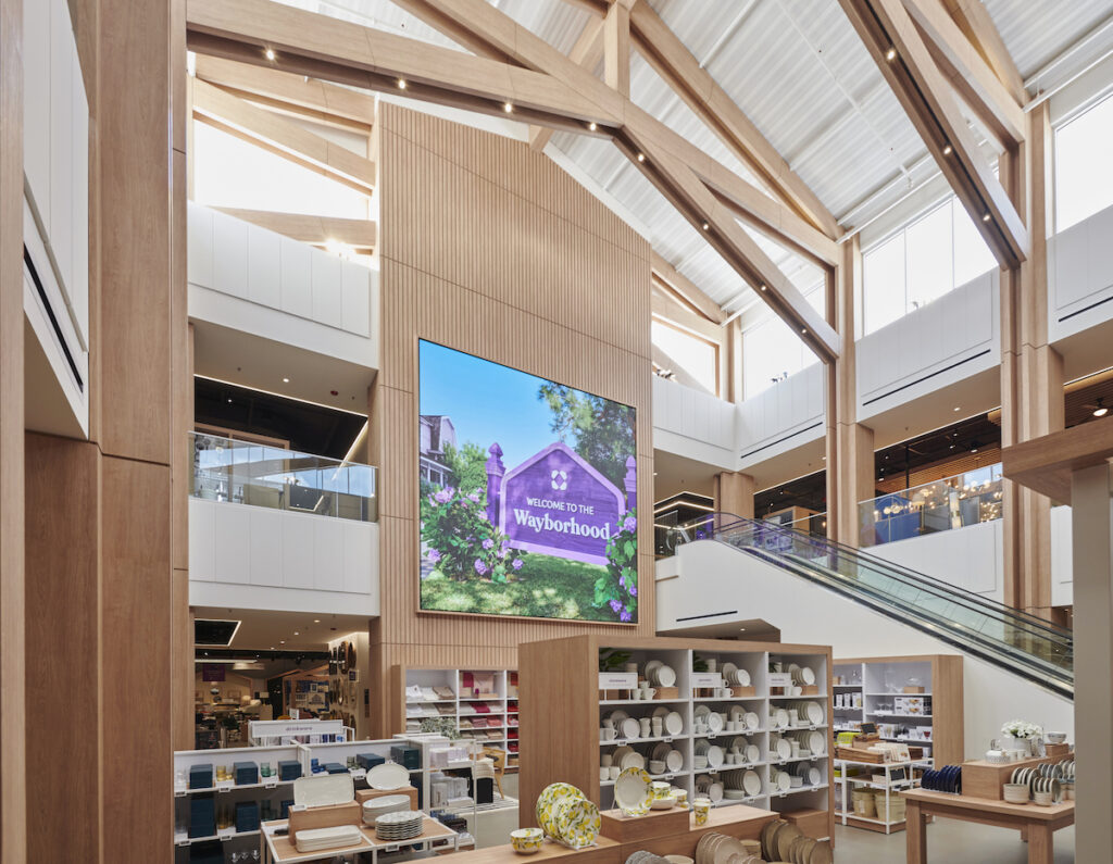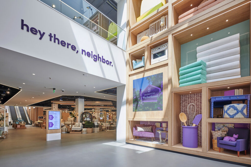 Wayfair Wilmette’s main entrance welcomes customers with a sun-filled and playful foyer. The opening message “Hey there, neighbor” is prominently displayed in Wayfair’s trademark purple. A digital screen rotates promotional messages on one side, while the other features oversized housewares and goods — like a toaster and towels — on shelving two stories high.