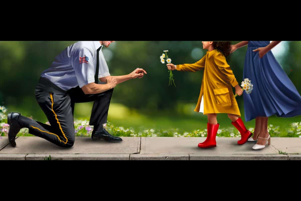 The image features a child, supported by an adult woman, handing daisies to a service member down on one knee — all on the backdrop of what appears to be a sunny spring day.