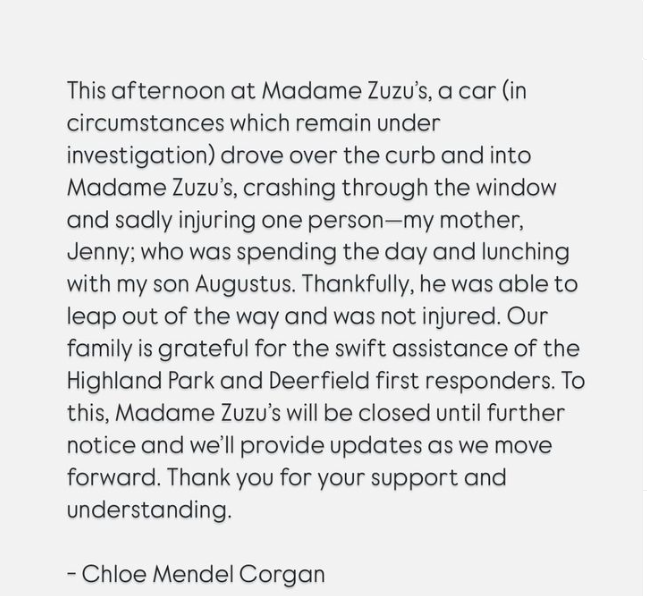 The business is owned by the husband-wife team of Billy Corgan and Chloe Mendel Corgan, the latter of whom posted a message on social media that says her mother was injured in the incident.