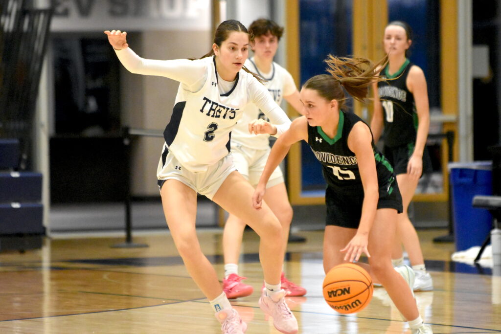 Trevians sophomore Emerson Buck lunges for a loose ball during a matchup with Providence Catholic.