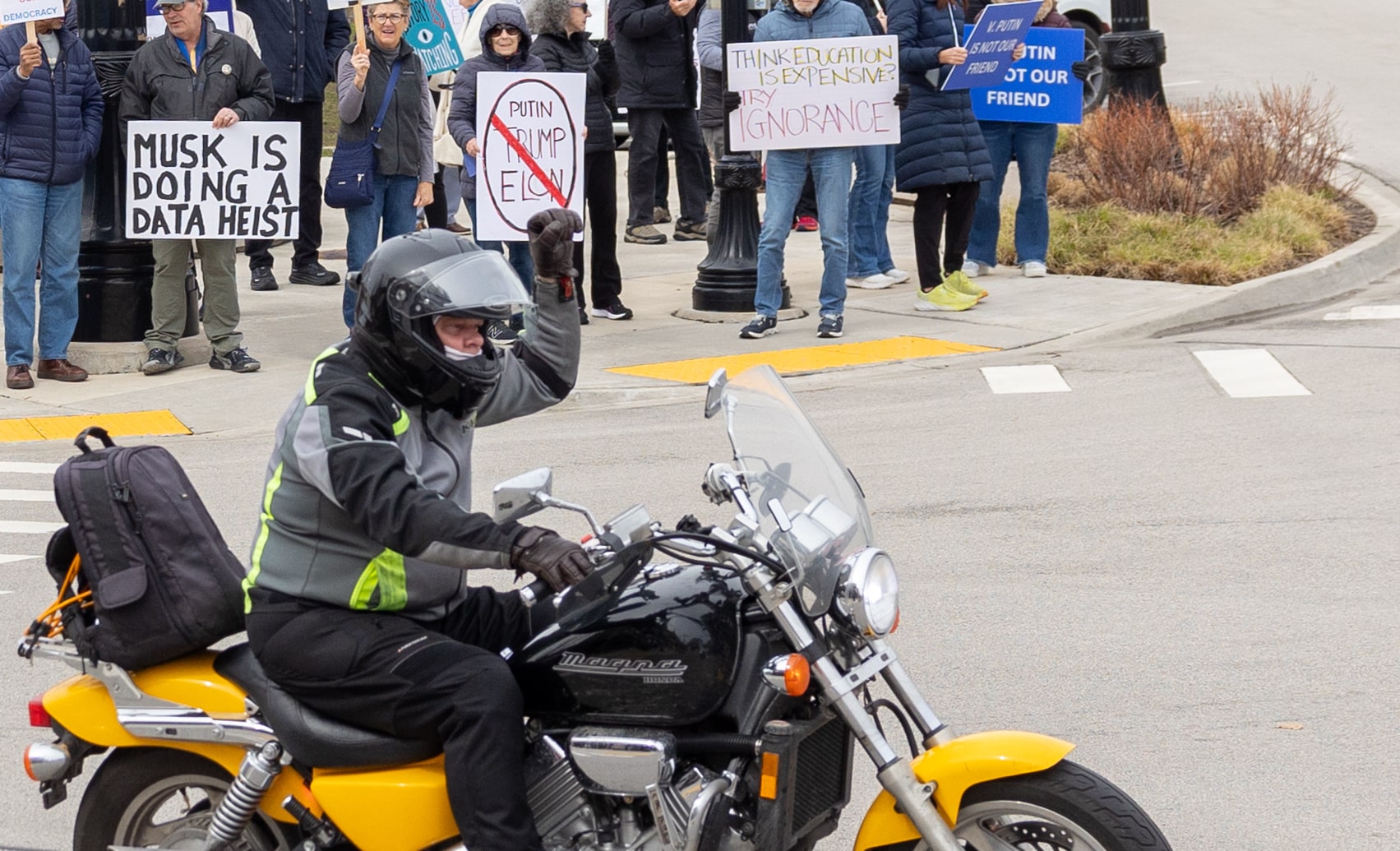 Many messages are critical of President Trump and his administration’s actions and behaviors. Some signs express support for Ukraine and others for the social security program. There are also always signs — “Join us from 11-noon” — that encourage more protest participation.