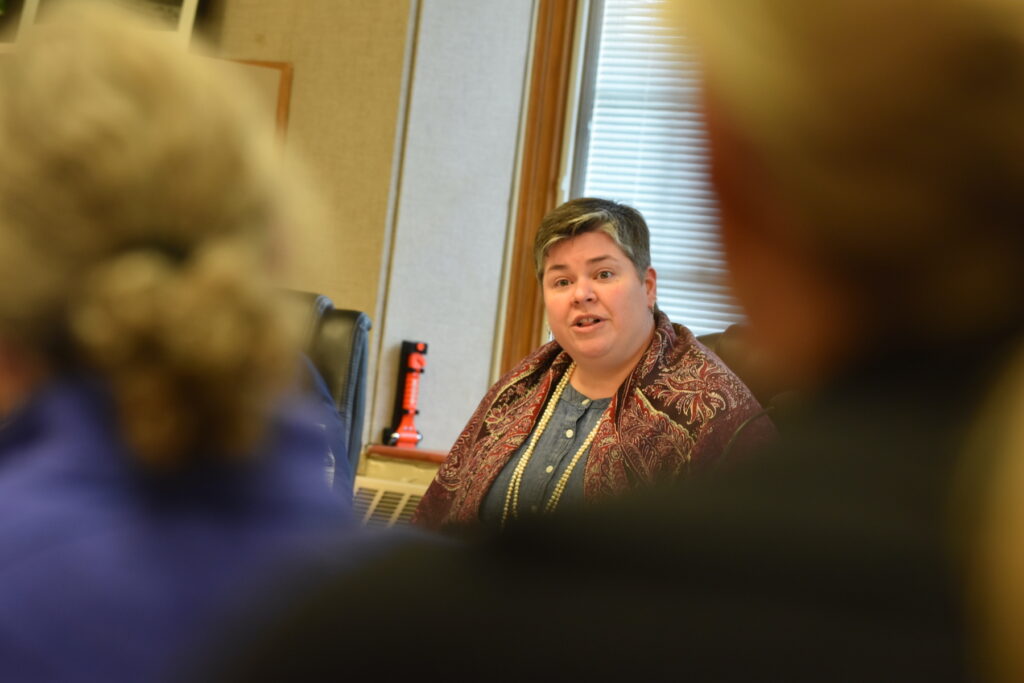 Heidi Smith, of the Highland Park library, responds to residents during the event.