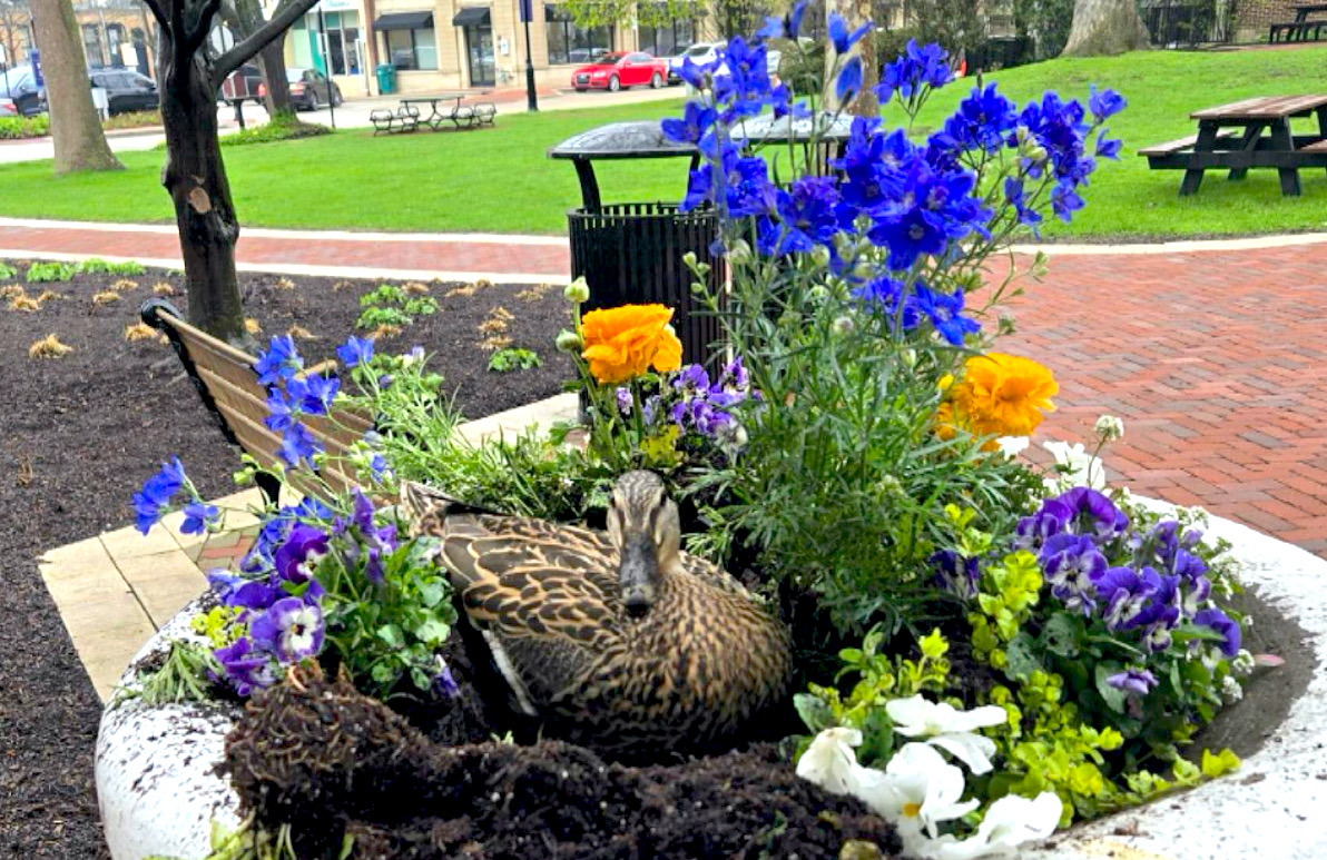 While the spotlight was likely not her intention, a female duck (or mallard) made herself at home among the bright spring flowers inside a raised planter near the entrance to the civic building.