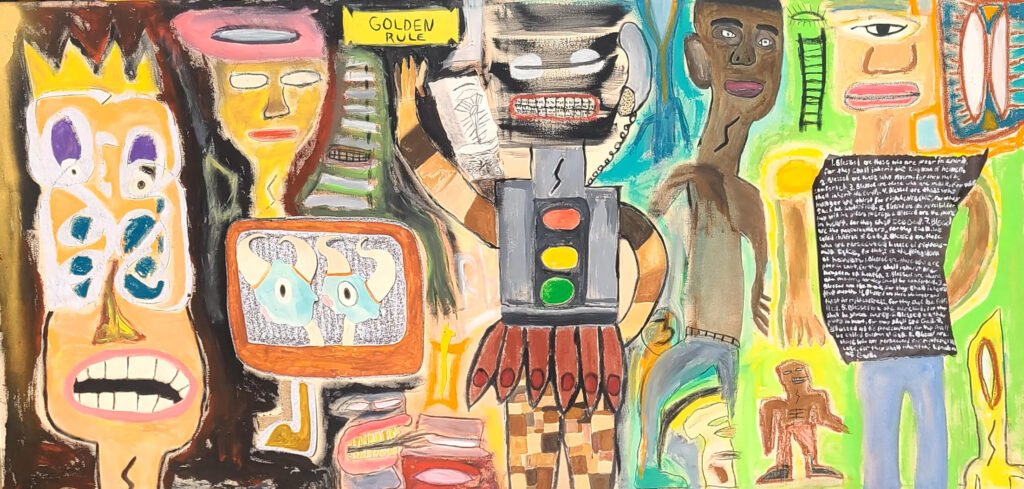 A painting titled the “Golden Rule” will be the centerpiece of Andrew Moreno’s debut art show on June 26 in Highland Park. | Image Submitted