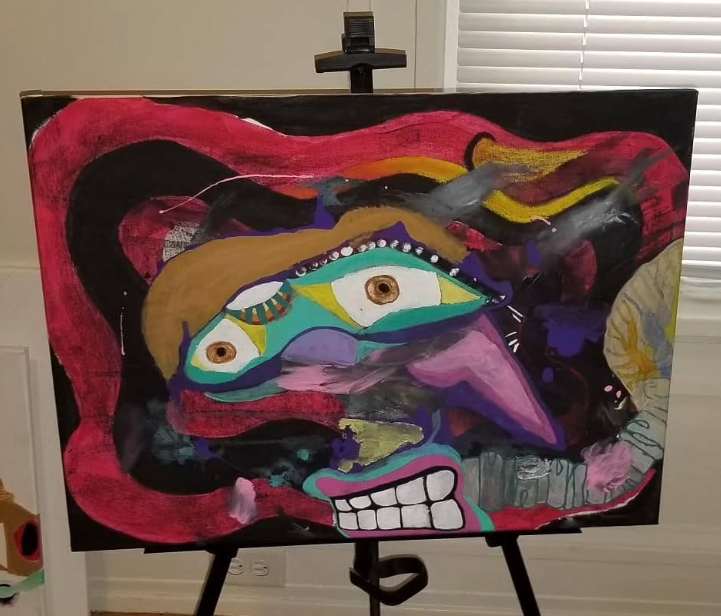 The 18-by-24-inch multimedia piece titled “Third Eye Guy” was Andrew Moreno’s first painting, which sold it to the actress Jodie Foster after she saw it in a house in Glencoe. | Photo Submitted
