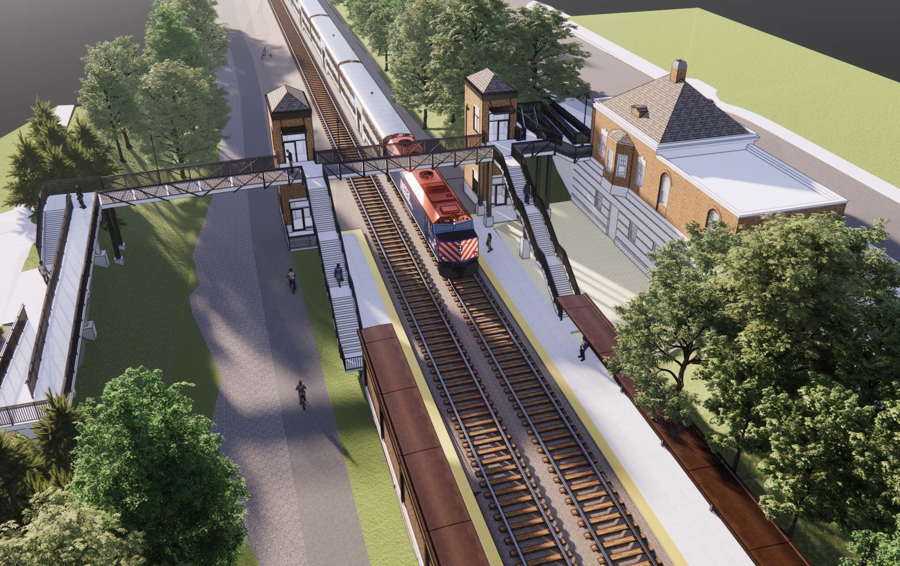The now-approved external improvements at the site include the replacement of the existing pedestrian bridge over the tracks, the addition of ADA ramps on both the east and west side for access to the new pedestrian bridge, and the addition of two elevators.