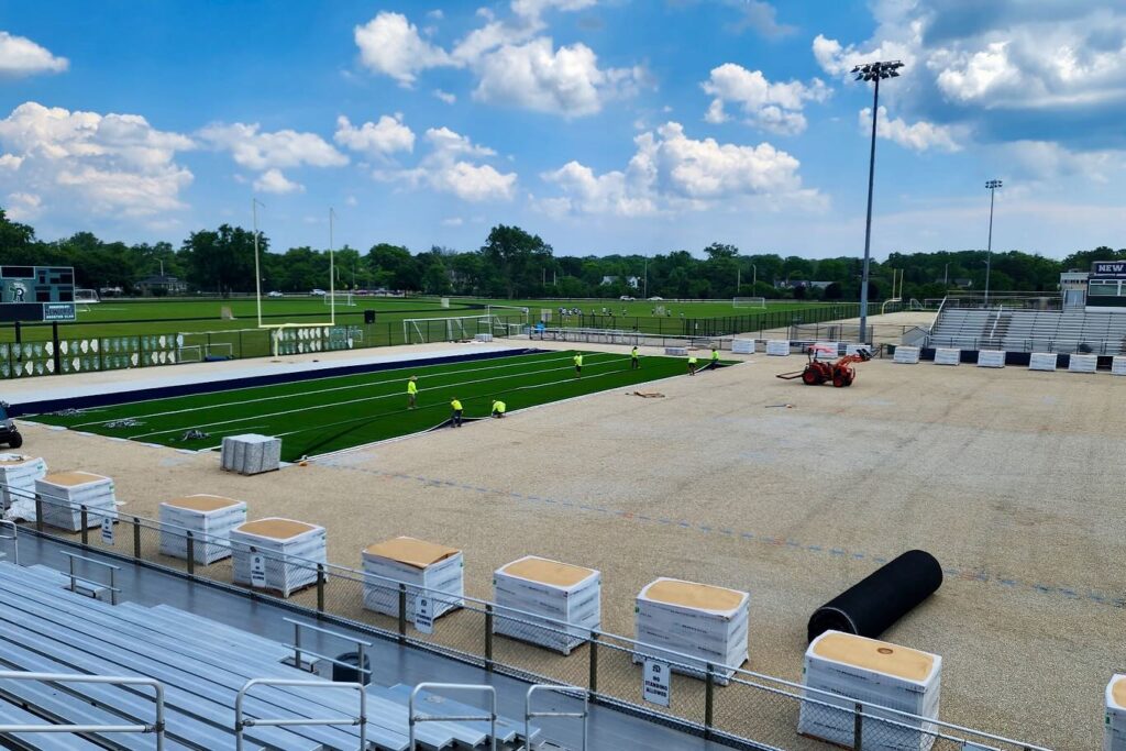 The field hockey and multipurpose fields are nearly complete as well, with the field hockey turf being glued in place and the final work includes seam work on the end zones and the installation of the New Trier logos.