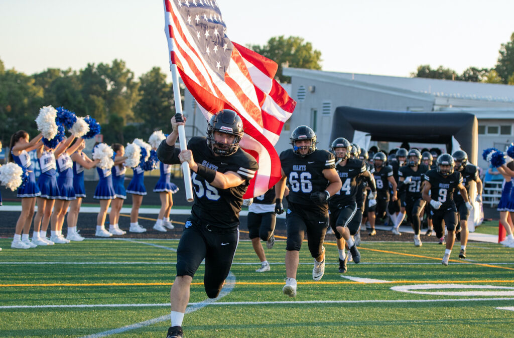 The Giants run out of the “tunnel” in front of their home crowd on Friday, Sept. 12.