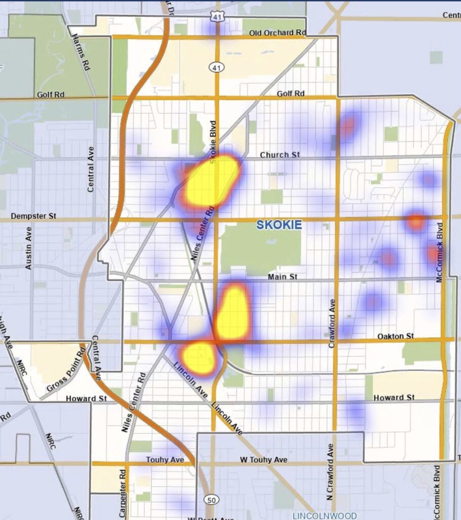A heat map informed with Village data shows where rat activity is most prevalent in Skokie.