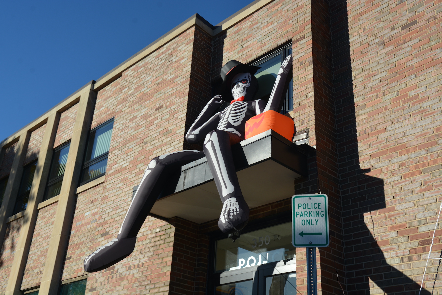 The police station features a large and spooky greeter for the season. The 20-foot tall inflatable skeleton perched above the entryway is on his best behavior, evidenced by his tophat and bow tie.