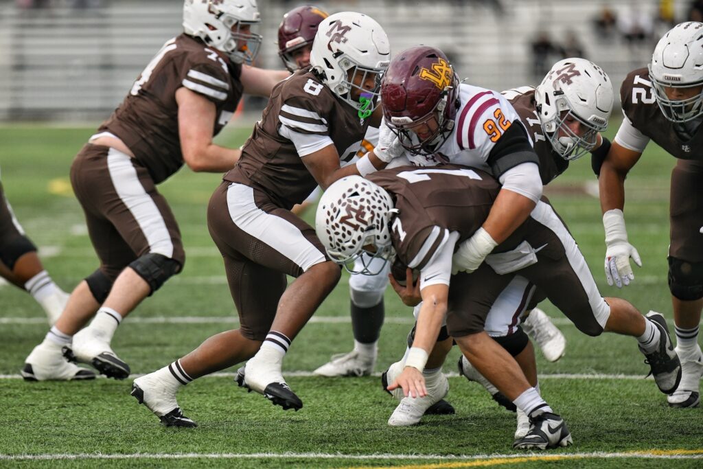 Senior lineman Kai Calcutt takes down Caravan quarterback Emmett Dowling.