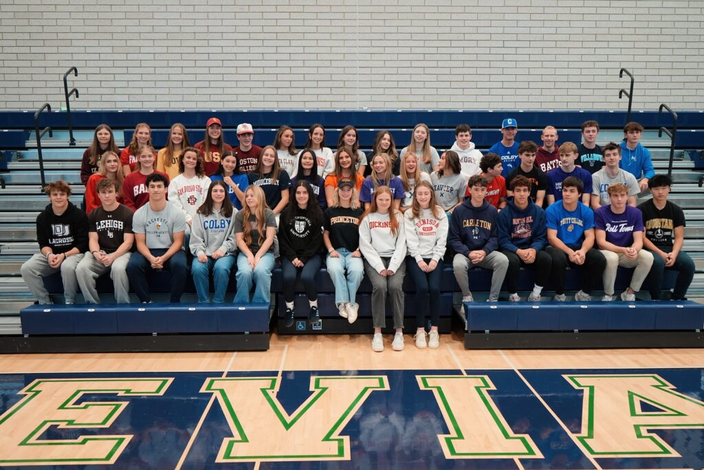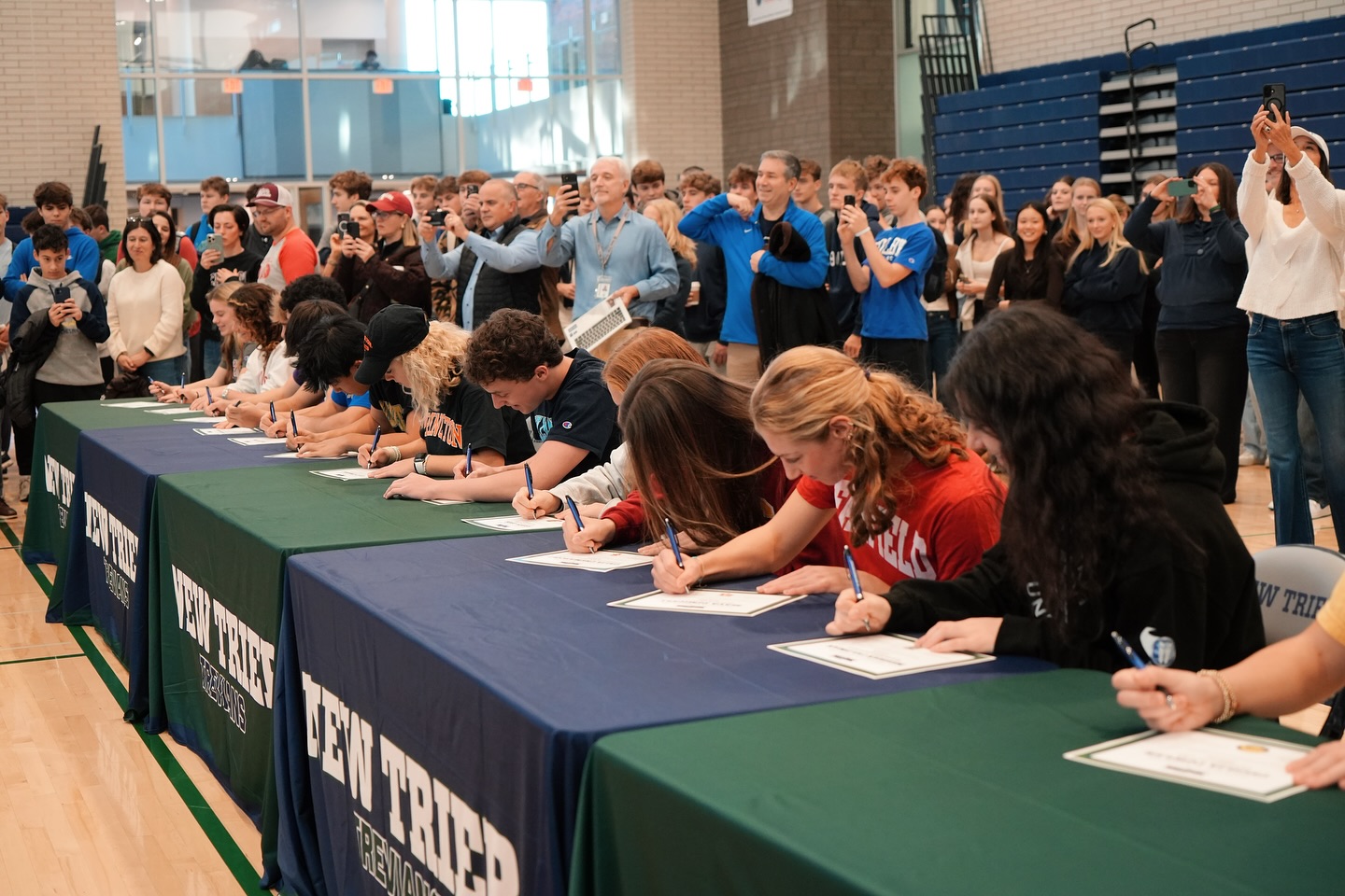 Wearing their college gear, 44 senior Trevians participated in this year’s ceremony, which included an unofficial “signing” as well as applause from gathered coaches, friends and family.