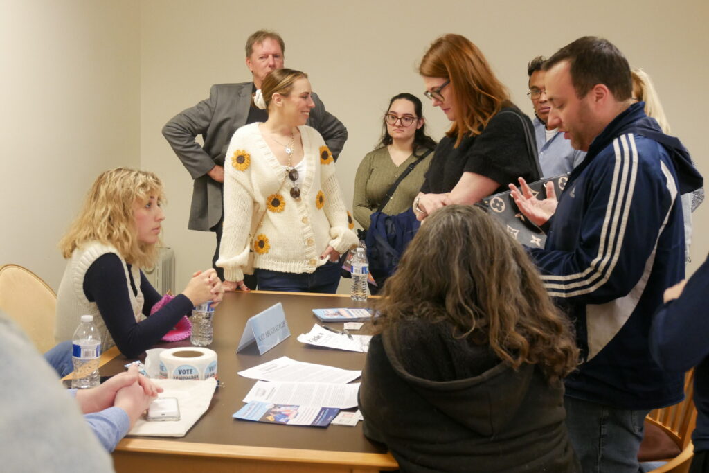 At one point, a handful of voters stood around Abughazaleh’s table on Sunday as they asked questions and shared their concerns about the candidate’s views on Israel and Gaza.