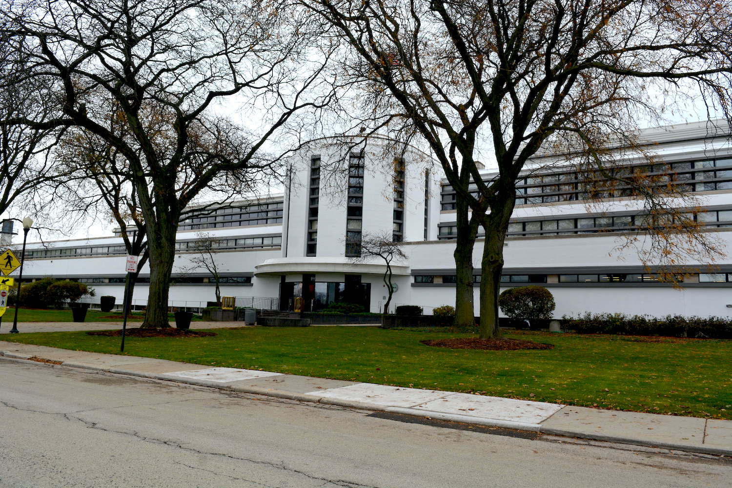 The Searle Headquarters — built of white-glazed brick with Indiana limestone trim and horizontal bands of windows that flank a cylindrical tower marking the company’s entrance — is pure geometry. With an address of 4901 Searle Parkway, this large building is hidden away in a small industrial park that is today part of the Illinois Science and Technology Park.