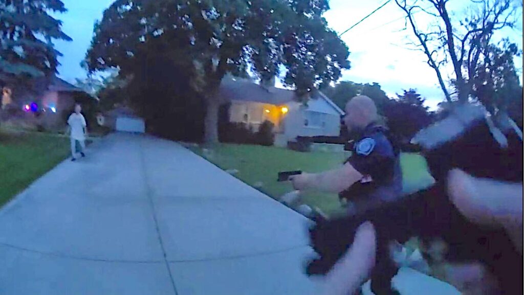 The officer who knocked on Bucholtz’s door initially shouted “gun” three times before retreating down the driveway with his partner. He then said into his radio that Bucholtz had a knife, which can be seen in the footage.