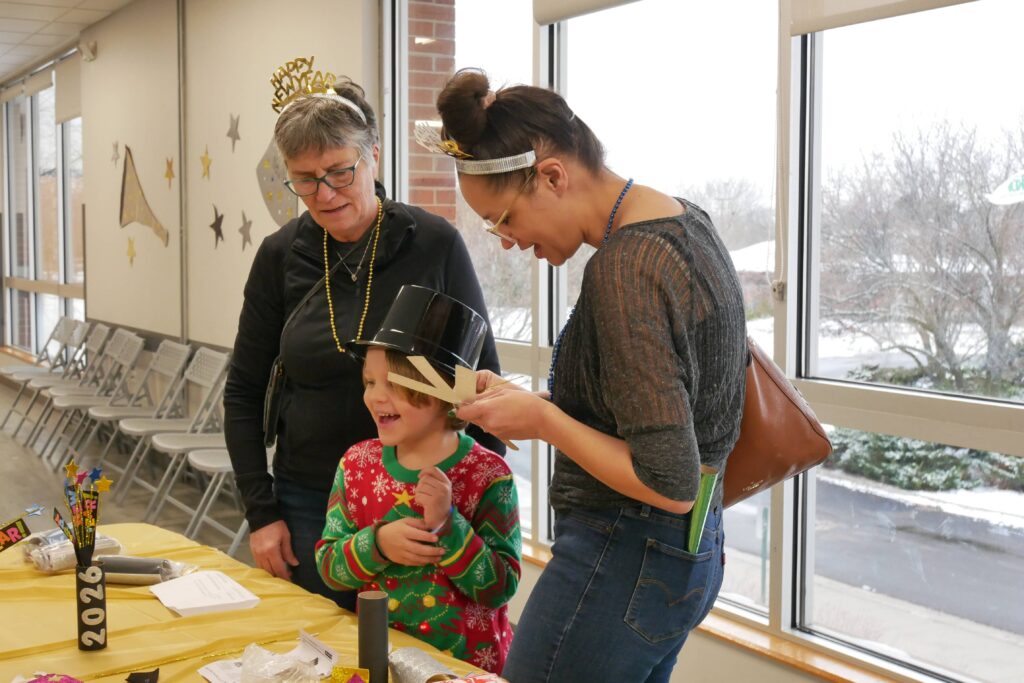 Event guests (left to right) Rosemary Baldwin, Quin Hayward and his mother, Rebecca Hayward, work on a New Year’s Eve favor.