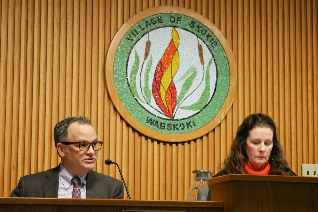 Next to Mayor Ann Tennes (right), Stew Weiss, an attorney with Skokie’s corporation counsel, speaks about short-term rentals at Jan. 20’s Village Board meeting. | SAMUEL LISEC / THE RECORD NORTH SHORE