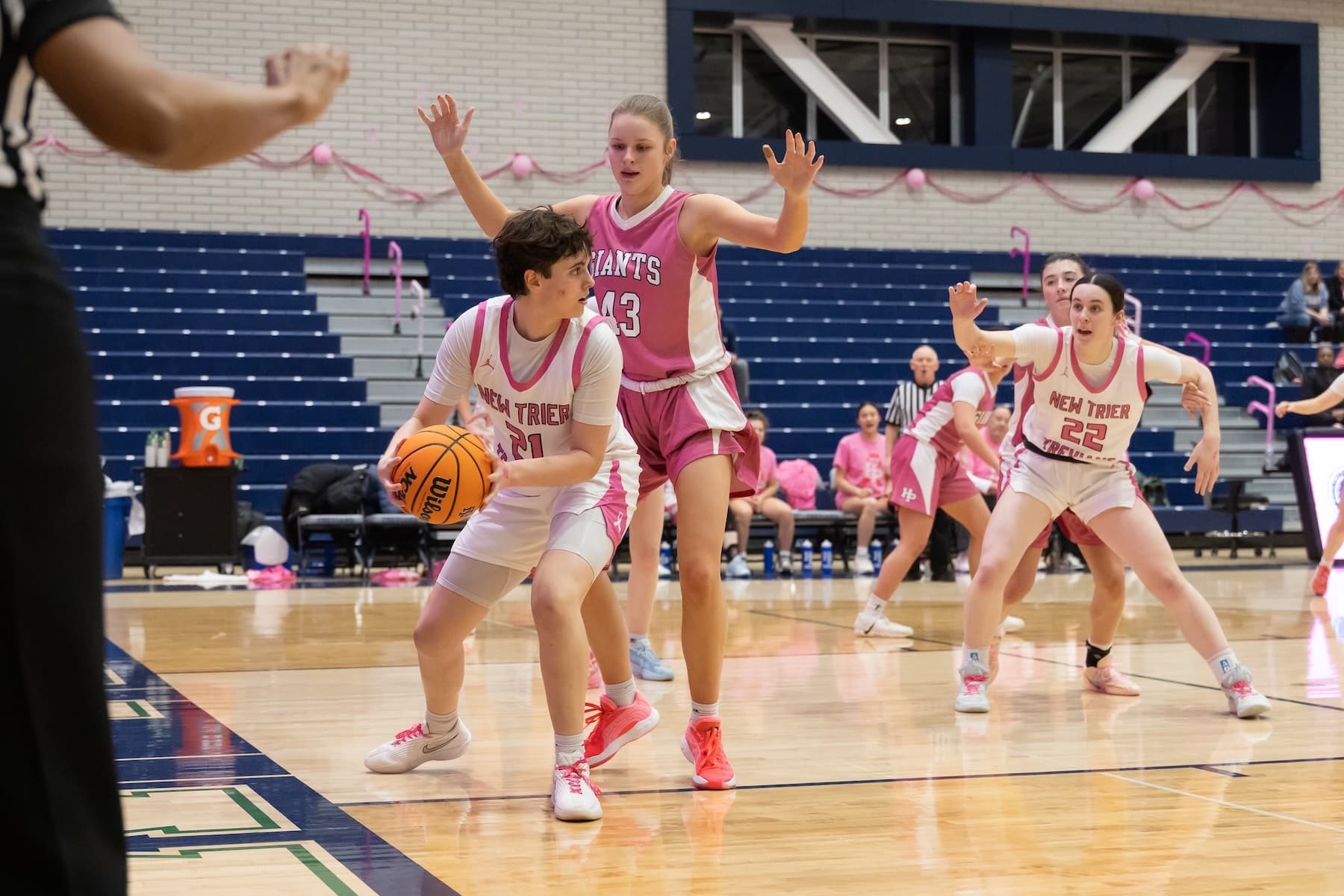 In a decorated gymnasium, the Trevians and Giants sported pink uniforms — the hosts in white with pink numbers and trim, and the visitors in pink with white numbers and trim.