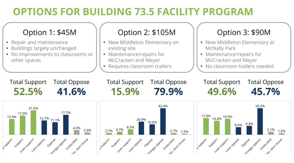 The most expensive, $105 million plan proposed constructing a new Middleton Elementary School on the building’s existing site while also conducting maintenance at Elizabeth Meyer School and McCracken Middle School.